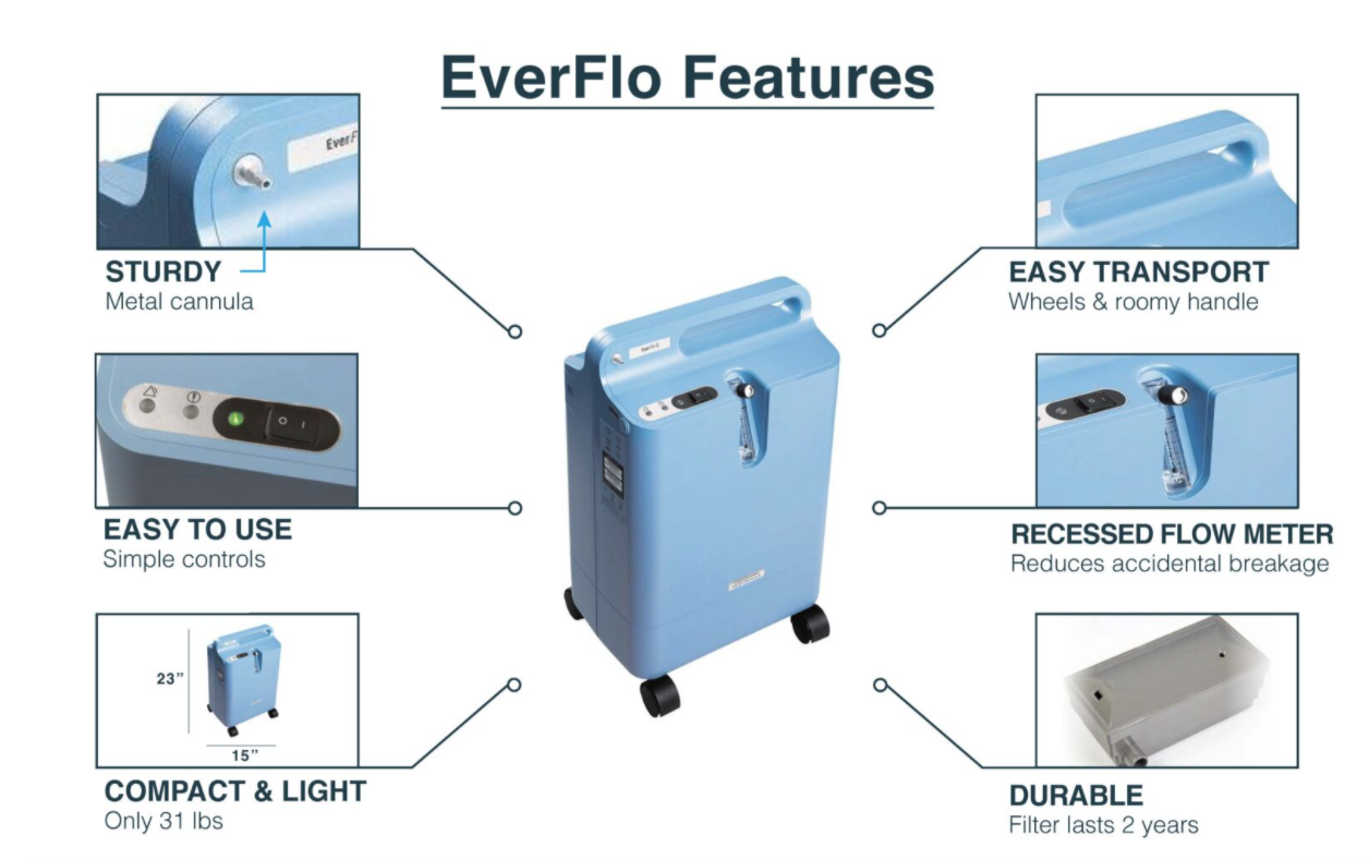 The Bundle Deal: Philips Respironics EverFlo Oxygen Concentrator with 10 Cannulas – offers maximum patient compliance and comfort, using innovative technology to deliver oxygen therapy in a highly efficient manner. The humidifier bottle holder accommodates all bottle styles. EverFlo’s small form factor, advanced motor, low power usage, and lightweight, durable construction make it easy, convenient, and very popular! The advanced motor provides 5 LPM of Continuous Flow Oxygen, while using less electricity and producing less heat, than most other stationary oxygen concentrators.