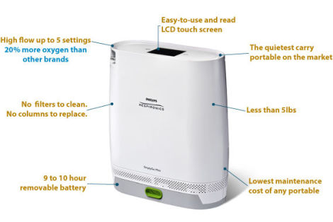 - Portable: The Phillips Respironics SimplyGo Mini oxygen concentrator is a portable machine. Its main purpose is to see that you do not have to worry about your COPD while also being able to bounce from place to place and live an active lifestyle. The product is lightweight and weighs a mere 5 pounds. Along with its small build, Philips SimplyGo Mini is easy to carry around wherever you want.