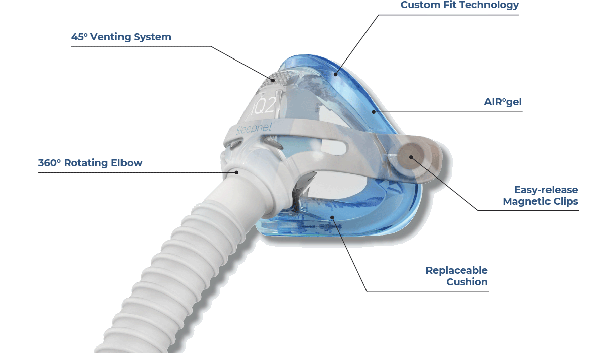 The Sleepnet iQ®2 Nasal Vented CPAP / BiPAP Mask with Headgear- One Size Fits All – features revolutionary patented AIR°gel® technology nasal CPAP and BiPAP mask providing maximum comfort while minimizing skin irritation and pressure points on the nasal bridge. Unlike many other gel masks, the unique qualities of AIR°gel® allow the mask to seal with minimal tension. By design AIR°gel® is twice as soft as competing gel products. The custom fit Patented Technology allows each user the ability to accommodate for various facial structure, changes in weight and facial asymmetry. The magnetic clips allow easy to have the mask on and off. The masks elbow and swivel is designed to rotate 360° degree for optimal tube positioning and easier mobility. The IQ2 Nasal mask is a vented mask designed to offer an integrated exhalation system with a built‐in anti‐asphyxia valve (AAV) for leak ventilation. One cushion fits all included. Manufactured in USA.